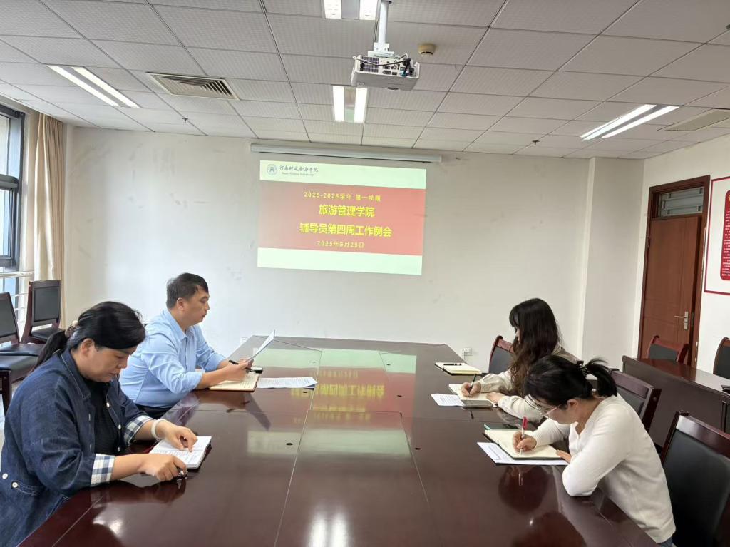 9月29日上午,旅游管理学院在207会议室召开第四周学生工作会。学院党总支书记郭轶、副书记谢雯和全体辅导员参加了会议,会议由谢雯主持。