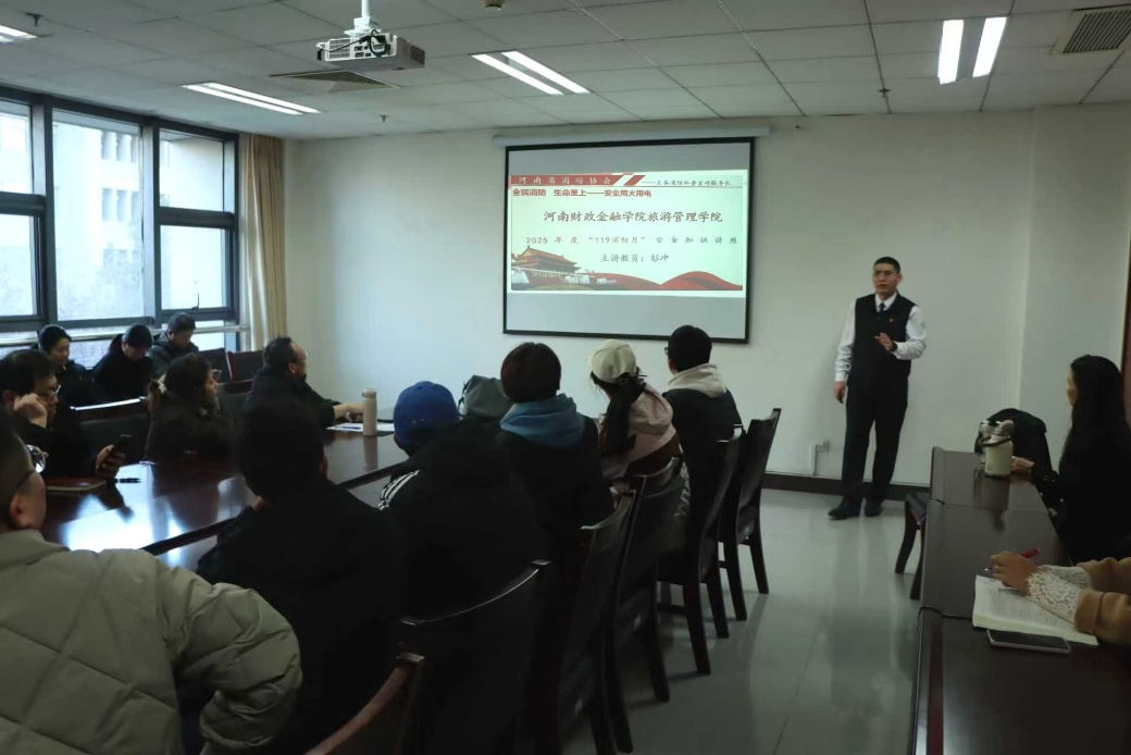 为切实增强师生消防安全素养与应急处置能力,11月18日下午,旅游管理学院在真知楼207会议室组织举办了消防安全知识专题讲座。本次活动特邀河南省消防协会义务消防科普宣传服务队彭冲教员担任主讲,旅游管理学院副院长顾家伟及全体教职工与学生代表共同参与。