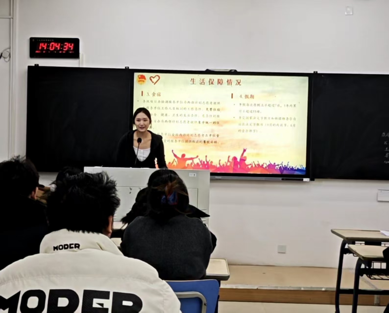 宣讲会现场,宋心妍热情地为大家解读西部计划新疆专项政策。她着重强调该专项是促进区域均衡发展的有力杠杆,也是培养青年人才的优质摇篮。谈及专项独特之处与个人成长机遇时,她激动地说,参与其中,既能为边疆教育、卫生等领域添砖加瓦,又能在实践中磨炼意志、开阔眼界。为了让大家感同身受,她还分享了往届志愿者的动人故事,这些故事如同一把把火,点燃了同学们心中的志愿热情,倾听了这些故事的同学们愈发憧憬加入西部计划,奔赴那片充满希望的土地。